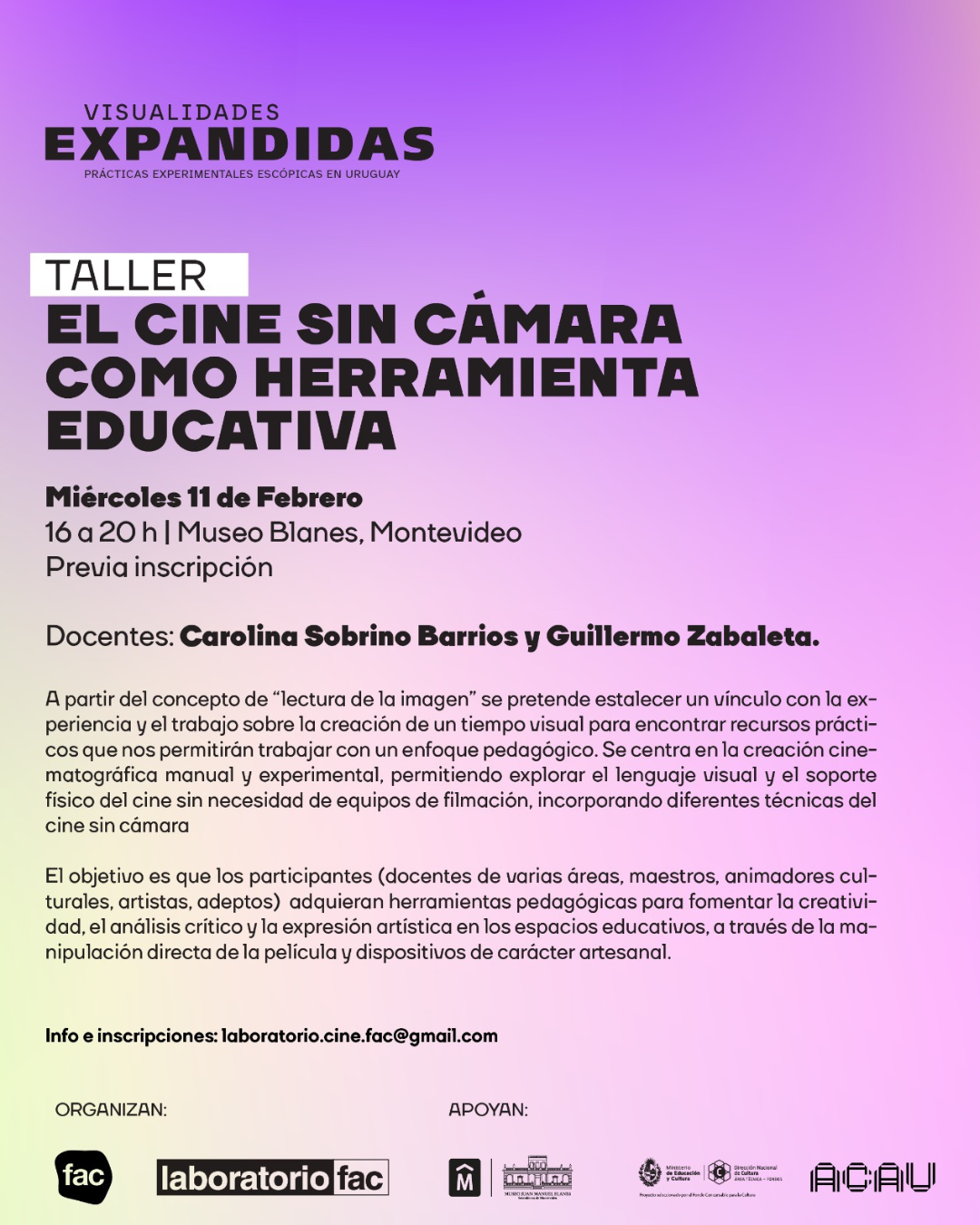 TALLER CINE SIN CÁMARA / LABORATORIO DE CINE FAC Feb 11 TALLER CINE SIN CÁMARA / LABORATORIO DE CINE FAC 16:00 - 20:00 Taller